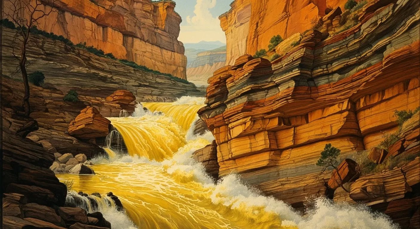 The children leaned further. The flotsam tumbled and spun, disappeared, bobbed up, and struck the cliffs. An eddy caught it and swept it into a cleft in the mesa.