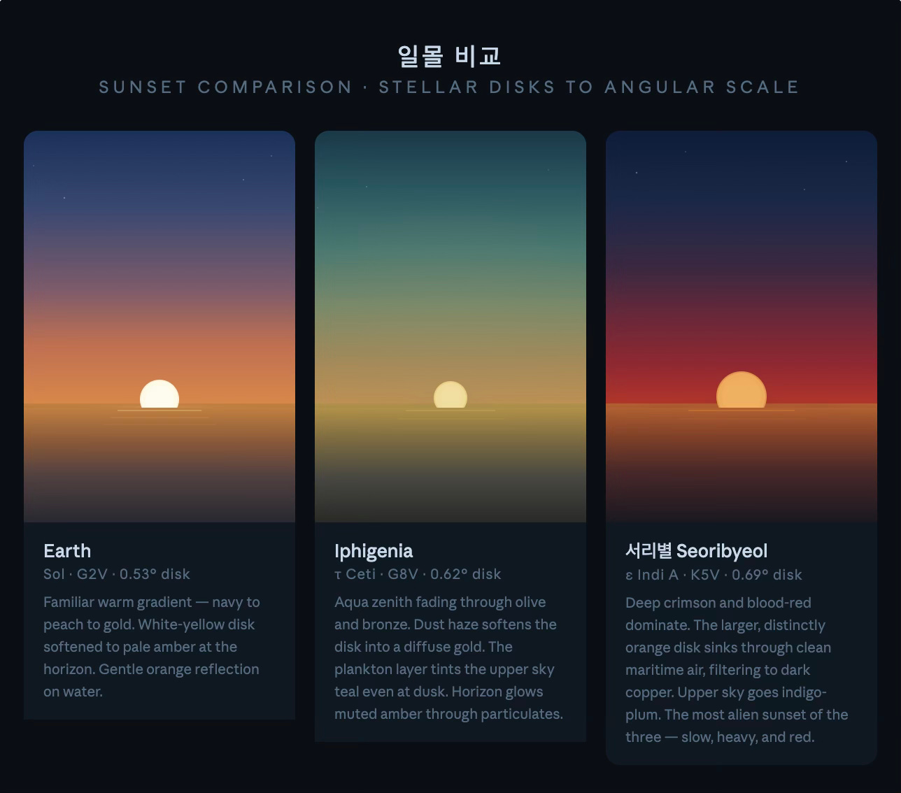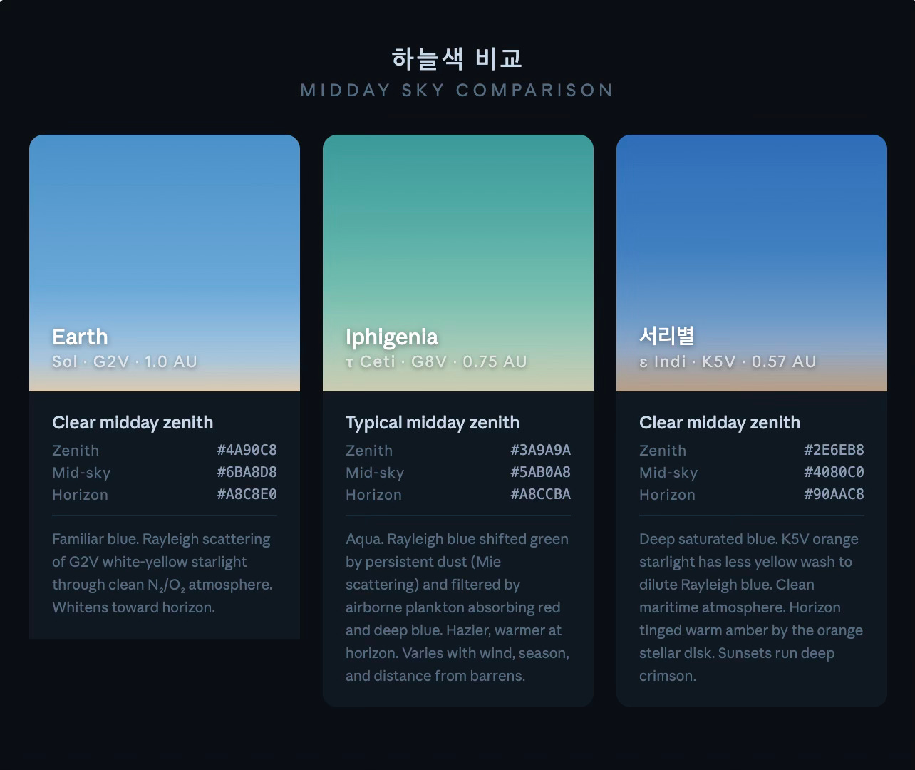 Here’s three skies, three worlds. Earth, some of you may be familiar with…I make no assumptions. Iphigenia—well, when I describe the sky as aqua, and the clouds as golden, I’m not kidding: the aeroplankton in the upper atmosphere (the primary source of Iphigenia’s oxygen), the dust particulates, the yellower sun, all combine to give the sky a green-blue cast. Seoribyeol’s sky resembles Earth’s with a darker shift towards violet because of the more orange color of Epsilon Indi—but behold where the differences really kick in, at dawn or sunset—